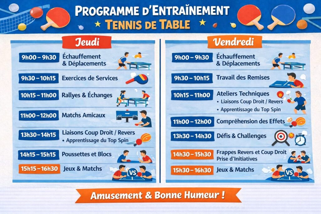 Profite de bons conseils pour revoir les bases du tennis de table et progresser plus rapidement, dans une ambiance conviviale et sérieuse.